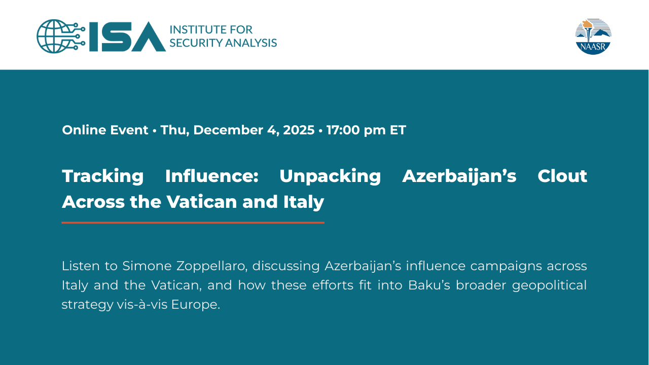 On 13 December, the Institute for Security Analysis (ISA) hosted Simone Zoppellaro, a journalist and researcher, to discuss his investigations into Azerbaijan’s influence campaigns in the Vatican and Italy more broadly. The lecture examined the evolving relationship between Azerbaijan and the Holy See in the aftermath of the Nagorno-Karabakh war and the forced displacement of Armenians from the region.